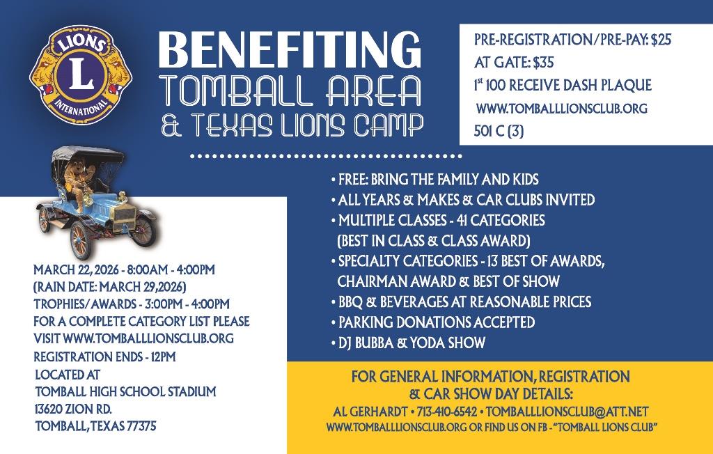 The 32nd (2026) Tomball Lions Club Car Show will be held on March 22, 2026!